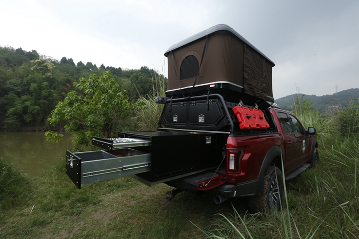 从旅行配置方面来看,福特F150独享侠旅行工具车拥有澳洲越野专用多功能顶架,可存放行李及其他设备,稳妥可靠。同时多功能越野专用抽屉式尾箱,则为车辆增添了更多实用属性。双层可拉伸拓展的尾箱中,有户外专用汽油发动机、户外移动厨房、冰箱、工具箱、户外专用50L双水桶等配置,为野外露营的水电使用奠定了基础。而车顶侧面的澳洲ARB遮阳棚和顶部户外露营双人车顶帐篷,也为野外驻扎休息提供了更好的条件。