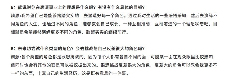 隋源在采访中表示:自己对工作会一直保持认真的态度,保持初心,踏踏实实的去塑造每一个角色,像这样敬业、脚踏实地的演员让人尊敬。