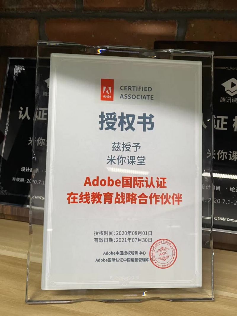 2020年8月1日,米你课堂已与Adobe中国授权培训中心达成战略合作关系,Adobe中国授权培训中心正式为米你课堂颁发授权书。