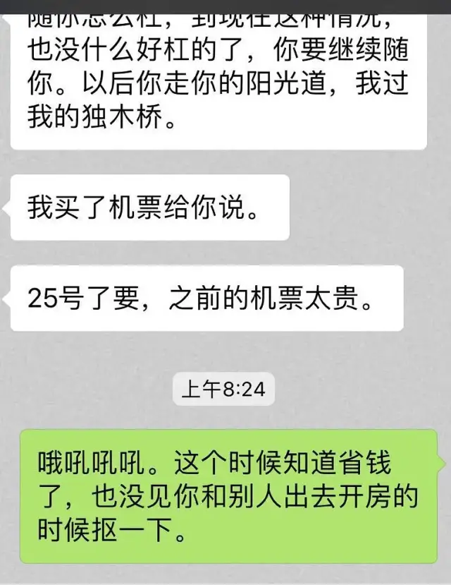 他狡辩自己和那个女人只是聊天过界,并没有发生什么。女生让他买套,是让他帮忙买行李箱的套子(excuse me?), 就这种鬼扯的理由,前夫的爸妈居然反过来劝我,让我不要胡思乱想,说他儿子在外面要应酬 有的时候没办法??
