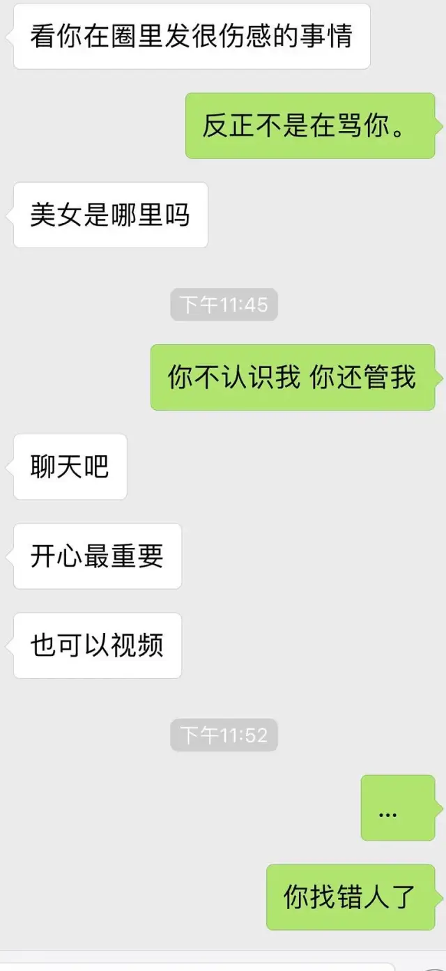 这里再说一个啼笑皆非的插曲吧,我回国有一段时间情绪低落,朋友圈里发了一些伤感的文字。前夫的表哥(有家室有孩子)估计微信没备注我的名字,忘记我是谁了,居然半夜发消息来聊骚我!!!