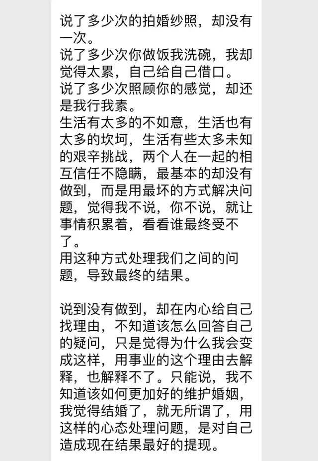 对于已经怀孕在身,或者已经有孩子的。我没资格告诉她们,应该离,还是不离。任何人都没有资格指责别人原谅了就是懦弱。我认识前夫从恋爱到离婚3年,都没有经历过婚礼、怀孕、生子。我看着以前和前夫领证的照片,也会闪过原谅的念头。我无比理解她们做出的选择,离还是不离 都是鼓起勇气才做下的决定。她们割舍不下的一定更多更多。所以想清楚自己要的是什么,真的很重要,觉得孩子最重要,那现在选择隐忍,将来需要和孩子一起独守空房的时候,不要后悔,也不要怪罪到孩子身上。觉得自己有个家最重要,将来面对一个不着家的丈夫,不要后悔。而我觉得自己快乐最重要,将来孤独终老的时候。我不后悔。