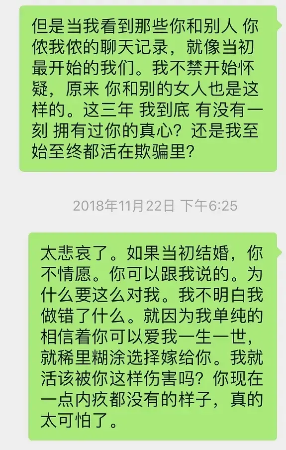 想着自己的丈夫,后天就要去约会别人,本来想再观察一段时间的我沉不住气了,拉着他爸妈和他对峙了。【这是我失误的地方,光有聊天记录,是没法证明他出轨的,法律上不能算证据】对比我的歇斯底里,他真的是全程冷漠脸,我在房间痛哭流涕,他还坐在客厅玩手机。