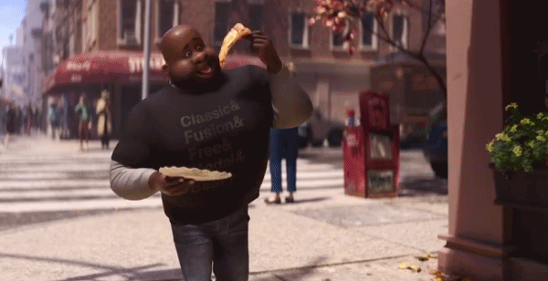乔伊的好哥们儿边走路,边拿起一块披萨吃。