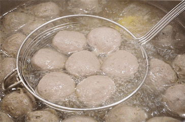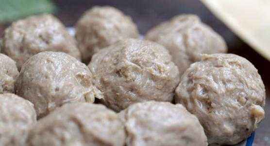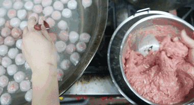 经上万次捶打的肉泥,摩擦发热,加冰水既让肉泥降温,也因为水的参与,让肉泥变成肉浆。调味料后还得继续槌打十多分钟,随后将肉浆用大钵盛装,用手使劲搅挞上劲,直至肉浆粘手而不掉下为止。最后手捻肉浆挤出肉丸,用勺掏进热水中定型。