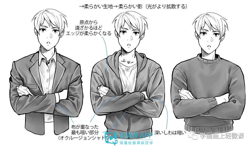 最后:根据材质的不同,宽度不一样的褶皱阴影则具有不同的柔和边缘或高光。因此,如果你想绘制出超逼真的衣服褶皱,建议你尽可能多地接触和研究材质。