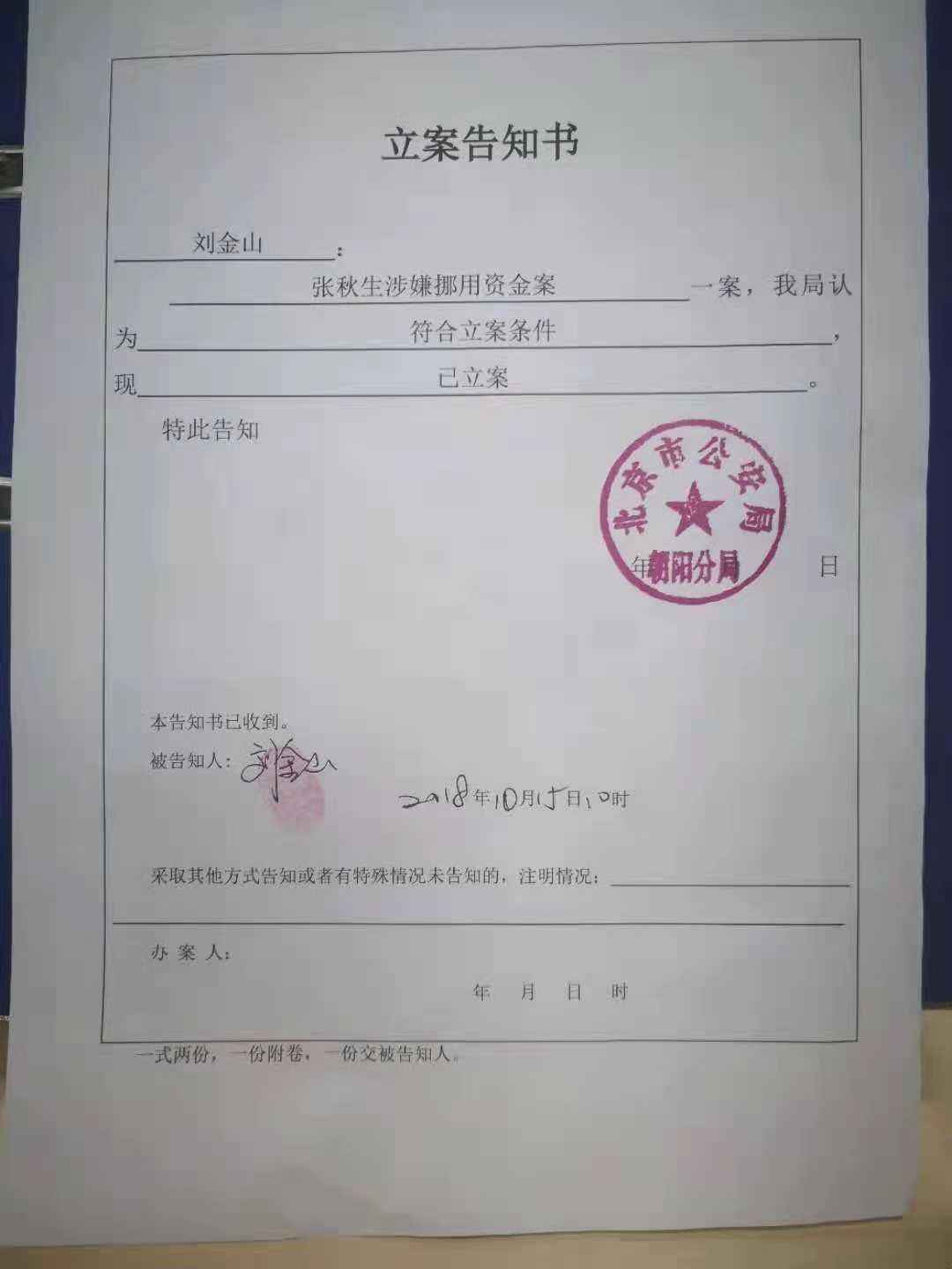 2018年8月,邦信阳公司创始股东刘金山和张保国向北京市公安局朝阳分局报案,反映公司法人、股东张某生利用掌管公司财务的职务之便,以员工借款名义从公司银行账户支出人民币190万元用于个人购买房屋、后以虚假发票冲抵个人借款侵占公司钱财的问题。邦信阳公司股东认为通过销售费用冲销掉的190万元个人借款均是法人代表张某生虚构的业务内容,根本没有实际业务发生,明显是利用职务之便侵占公司财产,严重侵犯了公司及股东利益。2018年8月15日,北京市朝阳分局经济犯罪侦查支队向报案人出具了京公朝经受字[2018]000233号受案回执:“你(单位)于2018年8月15日报称的张某生涉嫌挪用资金一案我单位已受理。”