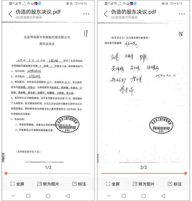 刘金山还向记者反映了一件张某生弄虚作假的事:北京邦信阳专利商标代理有限公司于1999年3月19日工商注册,营业期限20年,到2019年3月18日时营业期限将届满,但张某生除了利用职权私自于2019年将公司迁离原营业场所以外,为了申请延长5年的营业期限,伪造了除他本人、黄泽雄和张保国、刘金山之外的8名股东的签字。2019年12月,张保国、刘金山等股东,在朝阳区工商局查询到了这个伪造股东签字的决议。张保国、刘金山等股东认真商议,决定起诉张某生伪造股东签字。因为疫情的原因,一直在网上开庭,2020 年11月12日,最后一次网上开庭,邦信阳公司12名原始股东其中9名股东,本人或者委托代理人,以及个别股东的子女参加了庭审。除张某生、黄泽雄、张保国、刘金山以外的5名股东,一致否认了自己参加股东会议并签字。其中,特别失实的一个情况是,原始股东蒋某某已于2005年去世,张某生居然还伪造了他的签字。