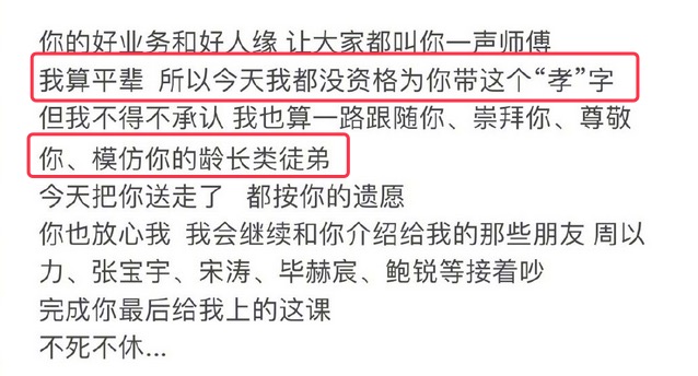 而在薛之谦的长文中,他最遗憾的并不是不能在赵英俊的追悼会上戴孝字。虽然两人关系非常好,而薛之谦也是一直当他是师父、当他是兄长。但是这改变不了两人是同辈的事实,所以戴孝字,注定不会是薛之谦。