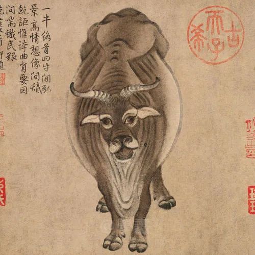 《五牛图》藏于故宫博物院,是中国十大传世名画之一。正如赵孟頫赞曰“神气磊落,稀世名笔”,五牛状貌各异,栩栩如生,是艺术形象中的典范。