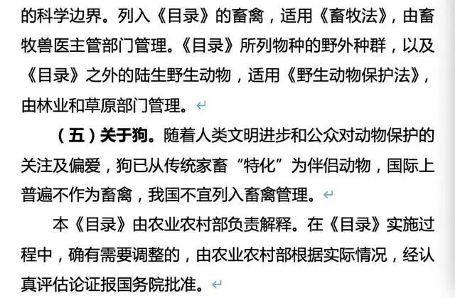 农业农村部于2020年4月8日发布的《国家畜禽遗传资源目录(征求意见稿)》中,犬已从畜禽目录中被拿掉。说明中解释称,狗已从传统家畜“特化”为伴侣动物,国际上普遍不作为畜禽,我国不宜列入畜禽管理。