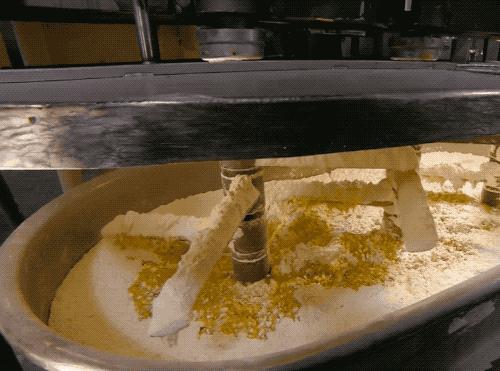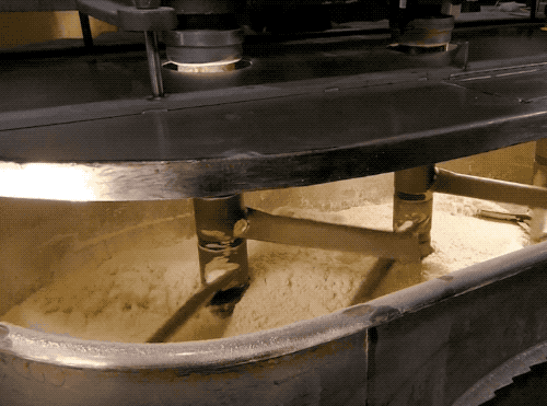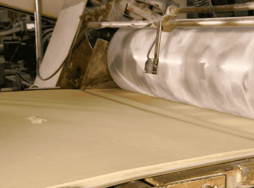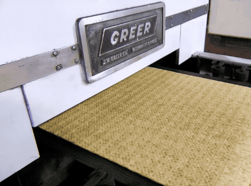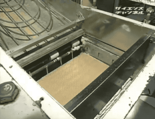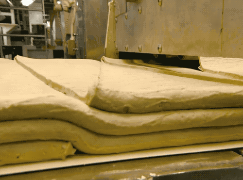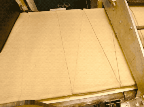 面团在滚筒之间穿梭,会给摊平碾压成 5 公分左右的厚面皮,然后给一层层地叠起来。这就是饼干吃起来有分层口感的原因了~