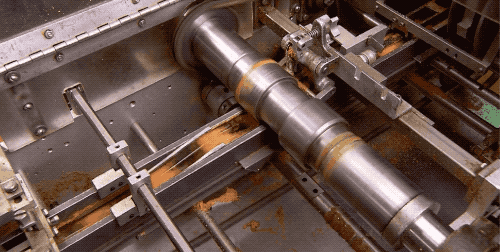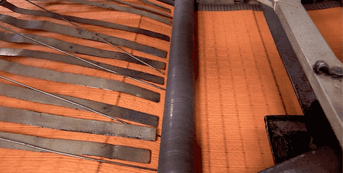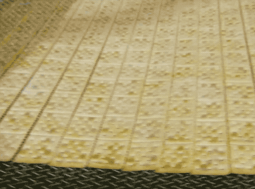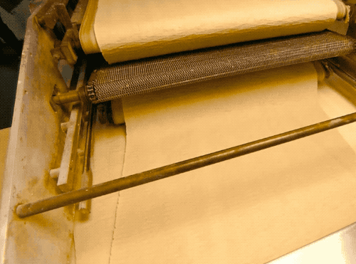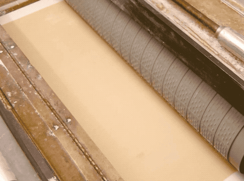 之后经过一系列的滚筒,把厚厚的多层饼皮逐渐压成大概一毫米的厚度,也就是把单个分层做薄了。