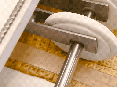 校正轮调整好饼干的位置,然后纵向对齐,滚轮再轻轻这么一压,就把饼干条给分成单片了。