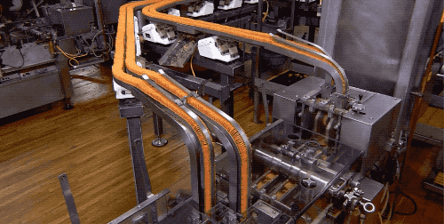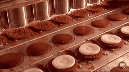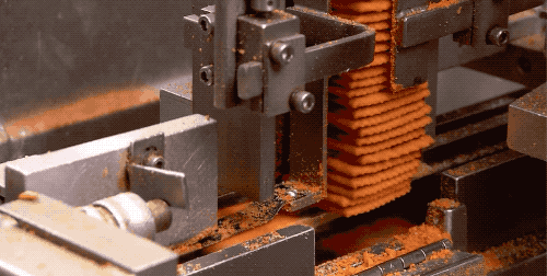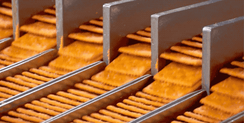 做好了单片的饼干,现在送入传送管道,要准备由下方的机器放夹心啦~