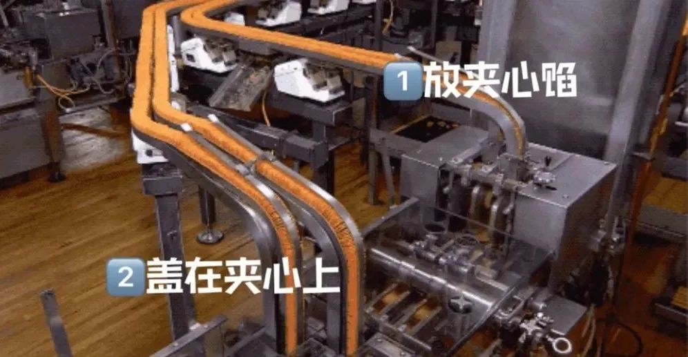 其实是一路去放夹心馅,一路等着放好后夹心后,直接就给盖在上面的!这样的处理节省了设备和空间,真的是十分机智了。