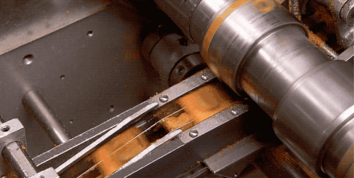 话说这里馅料的一次次断开,是有钢丝绳来做切分的,只是由于角度问题没法看特写,但实际上我们在之前的文章中是见过这种放料口的切割钢丝的~