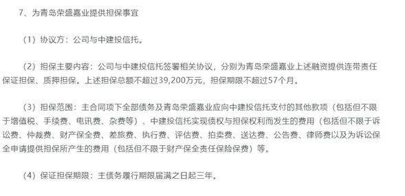 其中,荣盛发展在公告中称,为了促进青岛荣盛锦绣学府和荣盛未来广场项目发展,该公司全资子公司青岛荣盛嘉业向中建投信托股份有限公司(下称“中建投信托”)融资32200万元,由该公司为上述融资提供连带责任保证担保。荣盛发展将持有的青岛荣盛嘉业100%股权质押给中建投信托,为上述融资提供质押担保。上述担保总额不超过39200万元,担保期限不超过57个月。