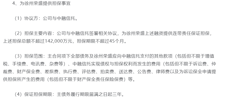 为了促进徐州悦盛生活广场项目发展,公司全资子公司徐州荣盛向中融国际信托有限公司(以下简称“中融信托”)融资130,000万元,由公司为上述融资提供连带责任保证担保。上述担保总额不超过142,000万元,担保期限不超过45个月。