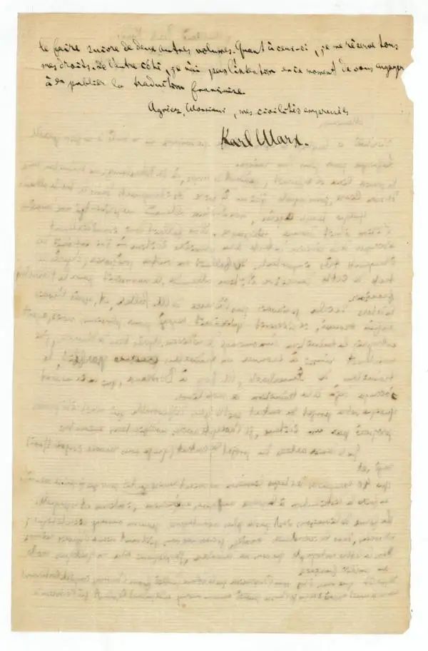 第二、第三封手稿为1872年11月14日和1874年11月12日马克思致拉沙特尔的书信。书信显示马克思本人对《资本论》法文版进行了不厌其烦的校正工作,他说“凡是我认为自己的翻译较之鲁瓦先生的翻译更好的地方都改了”。无怪乎他后来指出:“不管这个法文版本有怎样的文字上的缺点,它仍然在原本之外有独立的科学价值,甚至对懂德语的读者也有参考价值”。
