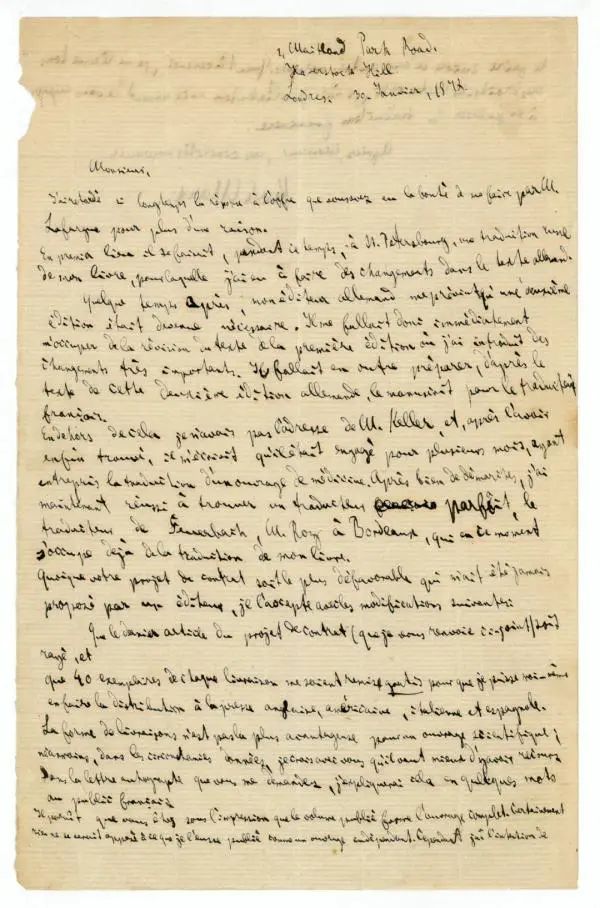 第一封手稿为1872年1月30日马克思致《资本论》法文版出版人拉沙特尔的书信。书信揭示了多个重要信息,如确定以即将修改的《资本论》德文版第二版作为法文版的翻译底稿;接受法文版出版人的建议,同意以分册形式出版《资本论》法文版。