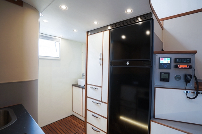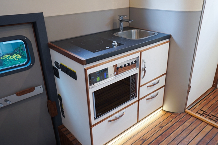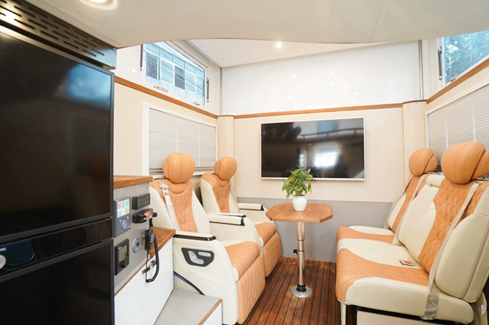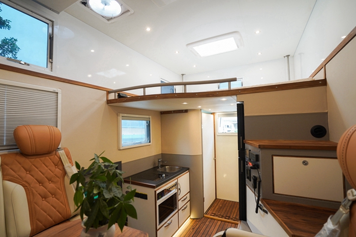 一层厨房区域、会客区域、洗漱区域,每个空间都有细节上的惊喜呈现。就比如厨房区域除了有很贴心的洗菜池外,下面还有特制的碗柜收纳,可以确保盘碗在里面被牢牢的“控制”住,不会在行车时散落。而与洗菜池同在桌面上的智能电陶炉,也可以满足简单烹调的需求。每天早起,煎鸡蛋、培根,制作美味营养的三明治,搭配热牛奶,开启元气满满的一天。会客区域中的航空按摩座椅也是很棒的设计,旅途中坐上上面打开开关,来个全身按摩,真是分外舒适惬意。