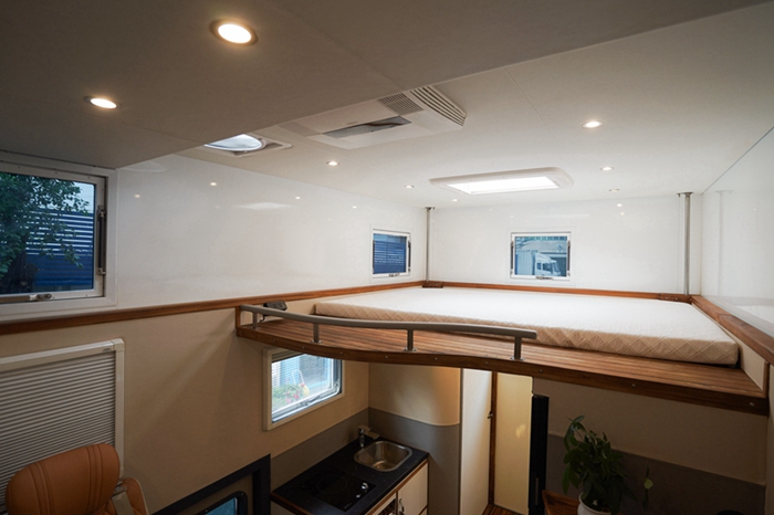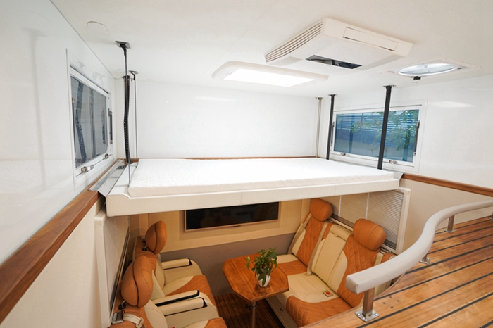 当然二层的睡眠区域也不能小看,搭配了房车专业的乳胶床垫,宽宽敞敞舒舒服服地睡一觉,谁说房车旅行就不能好好睡觉了呢!再加上车顶的全景天窗,看蓝天白云、看流星许愿,满足大家的“少女心”,还原童真童趣。当然还有贴心的床头灯,为你点亮一片角落,让你静静地看书,听听音乐,幸福的不得了。此外电动升降床也是一大亮点,这么大的空间,还担心没地方睡吗?