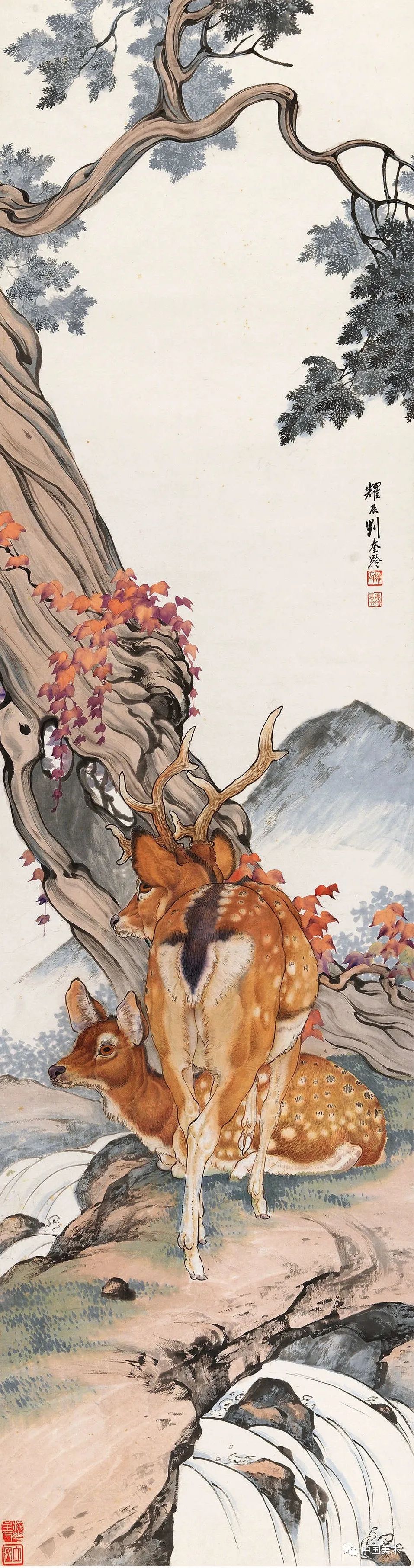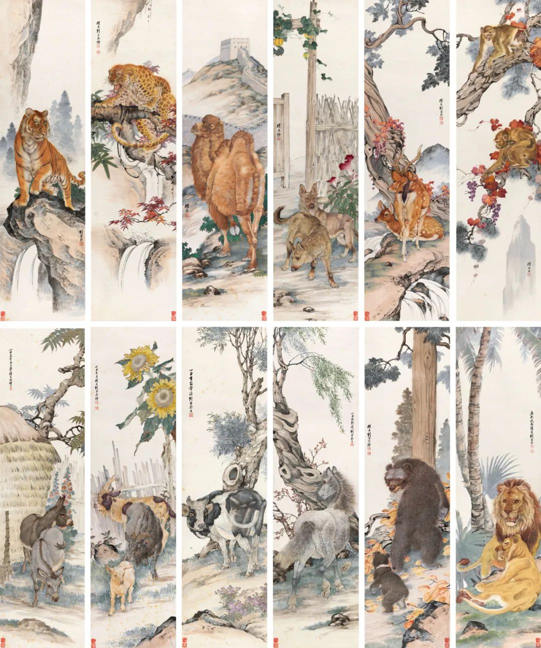 《走兽十二屏》是刘奎龄动物画法成熟时期的代表作,分别绘红枫双猴、秋柏双鹿、竹篱双犬、长城骆驼、三羊开泰、草垛双驴、柳荫单骏、秋林熊戏、崖瀑啸虎、柳下花牛、草树双狮、泉枫花豹等。所绘或为平日寻常所见的动物,或为西洋舶来的珍奇走兽,但都栩栩如生,画家不仅仔细描绘动物,同时也特别关注它们生活的环境,有些动物虽然是他不能亲在现场观察体验的,便借助乡间生活、异地旅行、对传统山水的琢磨和国外的图片资讯,发挥自己的想象力,将它们置于合情合理的环境中,这种对艺术灵感的调动,使他进入“法心源”的别样天地。刘奎龄先生的每件作品都有比较详尽的手稿,基本都是在几经推敲修改之后,再用墨线勾定。而在创作时,尤其是表现这些皮毛比较长的动物时,刘奎龄用其独创的“湿丝法”为之。