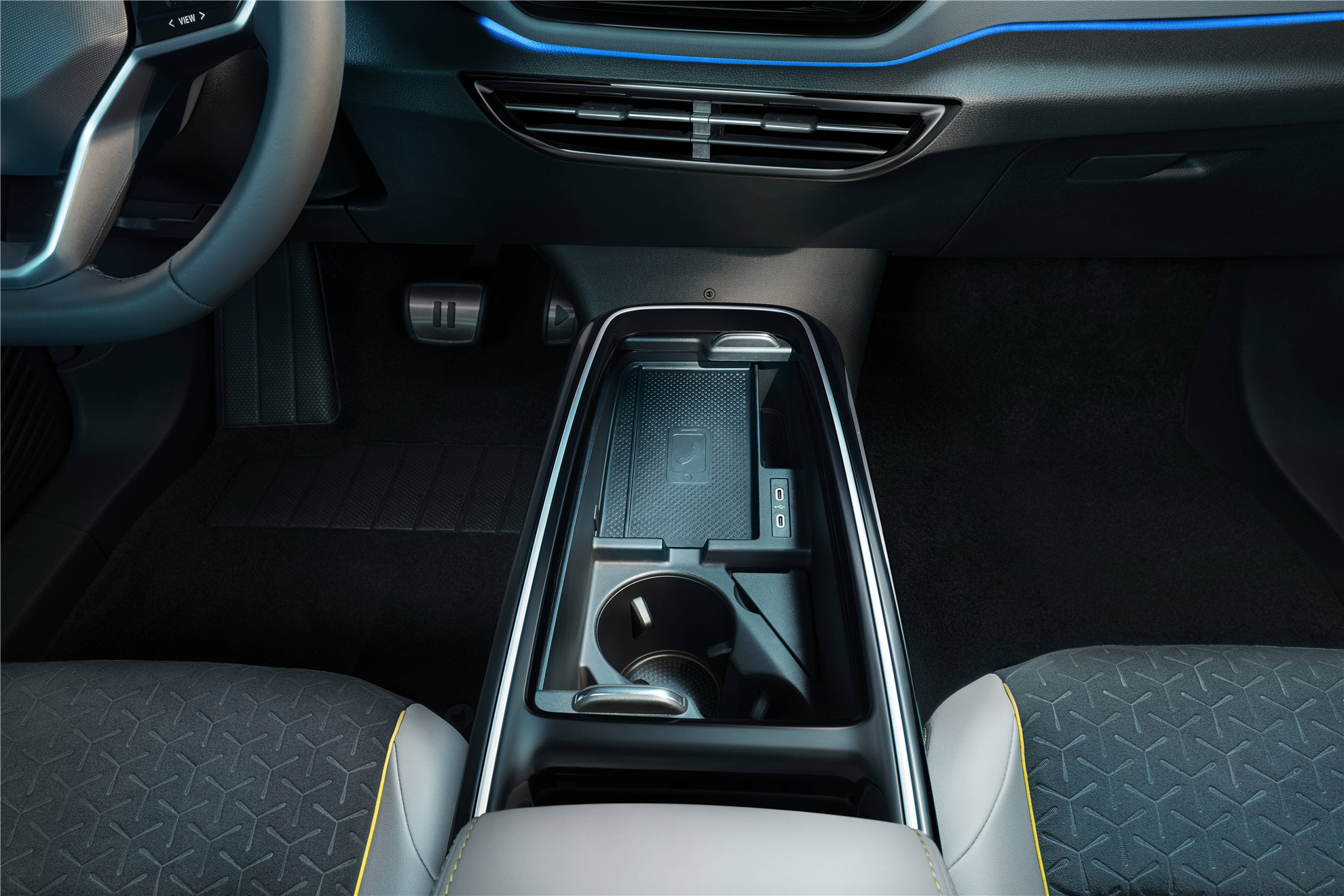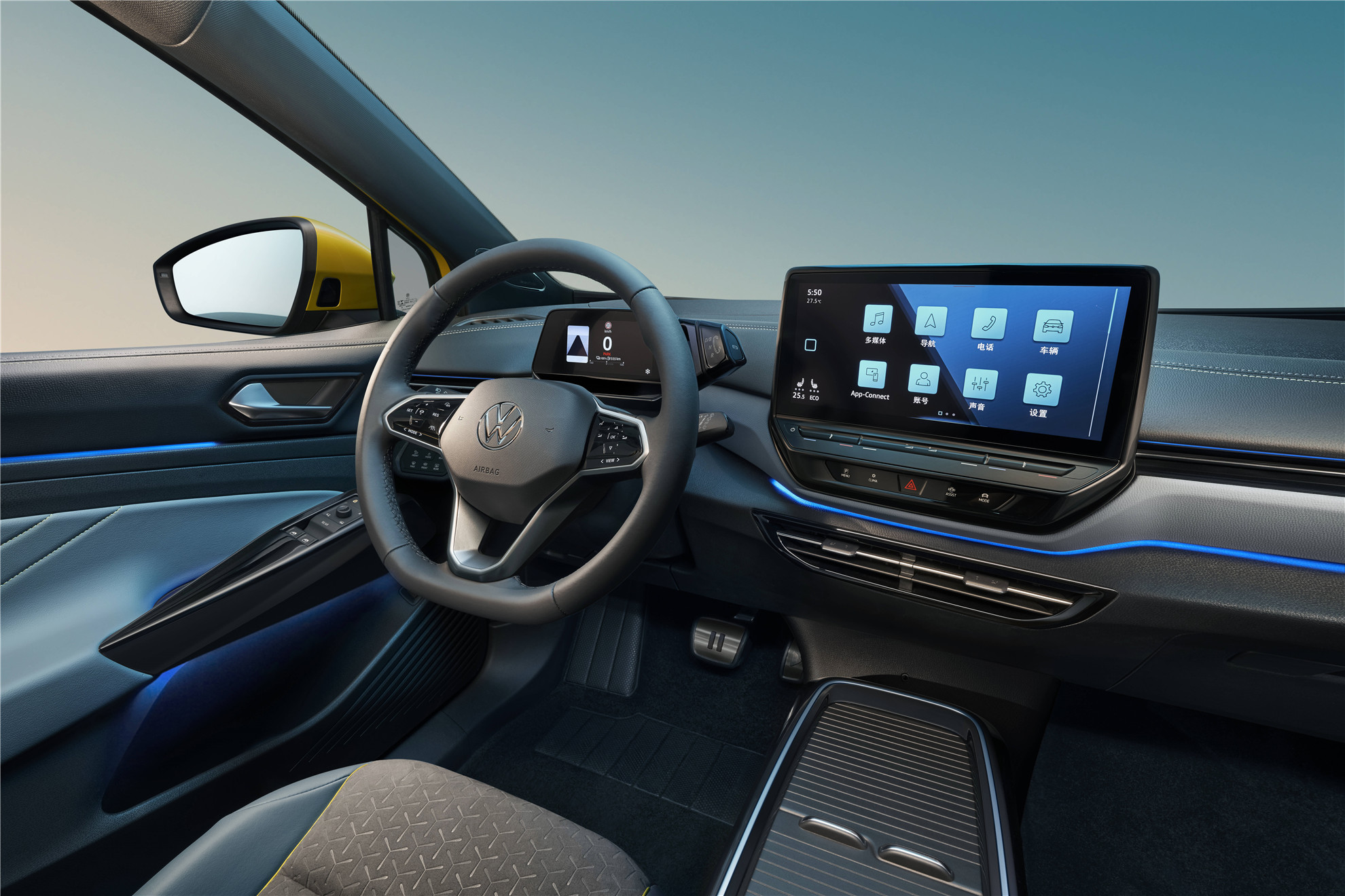 特别是在色彩部分,ID.4 X提供潮流坐标、典雅格调及都市激情3种个性配色包,分别赋予精致、奢华与运动的风格,再与外饰颜色搭配共计带来10种配色方案。例如,潮流坐标选用蓝灰及黄色作为内饰主题色,可搭配黄、蓝、灰、白四种车身颜色,并采用银色车顶流线拼色饰条。此外,座舱内应用心情炫彩氛围灯,5种氛围主题及32色氛围灯颜色,营造出专属的灯光效果
