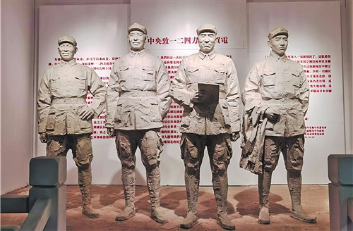 图② 《中央致一二四方面军贺电》前的朱德等红军领导人塑像。