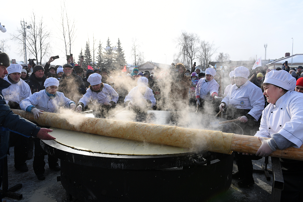 当地时间2021年2月6日,俄罗斯鞑靼斯坦共和国,当地大厨们架起巨型烤炉创造了”世界上最大的煎饼“,直径长2.51米,打破了吉尼斯世界纪录。
