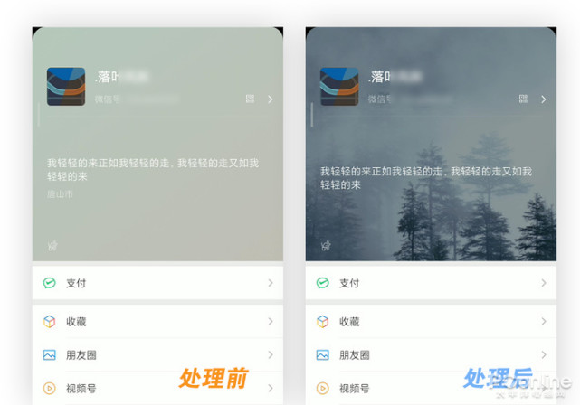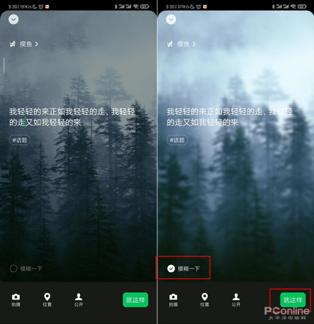 接下来点击红框里的“拍摄”,实拍或选择一张现有的图片。这里微信提供了一个“模糊化”按钮,可以根据需要决定是否对图片施以模糊。等一切准备停当,点击“就这样”,状态背景图就设好了。