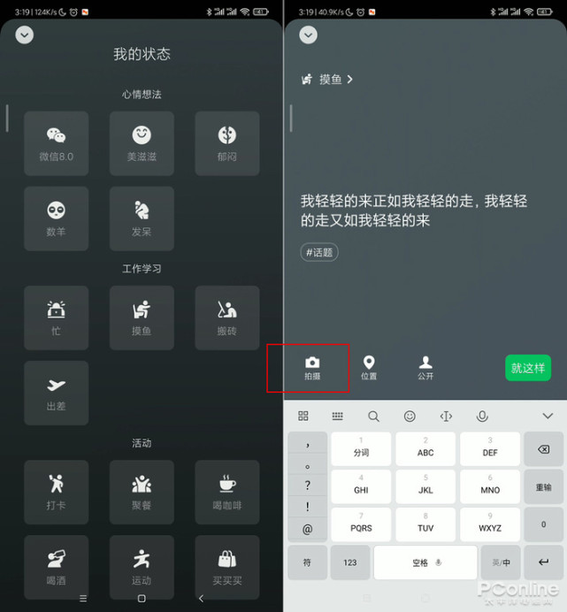 有没有感觉默认的状态面板有点大?看上去空空落落的?这个嘛……还真怨不上微信,因此这里原本就是留给背景图的。打开微信8.0,点击“我”→“状态”,挑选一个状态图标,写好自己的状态签名。