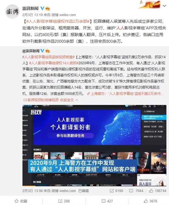 2月3日,一条新闻让整个社会舆论为之炸锅:“人人影视字幕组”被查,14人被捕,涉案1600多万元。