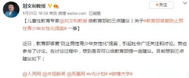 1月31日,刘文利微博发文,“给教育部的三点建议”: