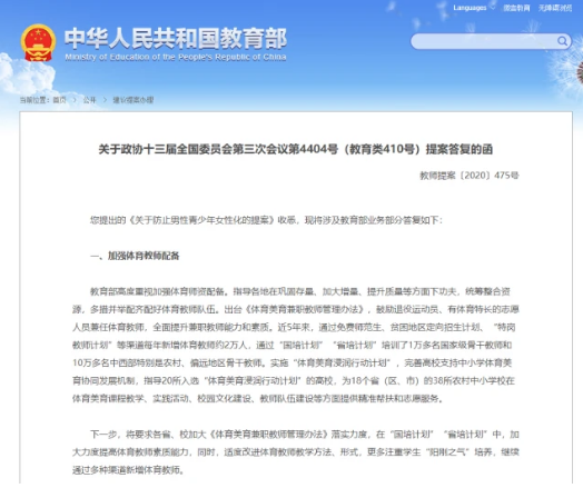 就全国政协常委斯泽夫2020年5月提出的《关于防止男性青少年女性化的提案》,教育部1月28日答复称,将“适度改进体育教师教学方法、形式,更多注重学生‘阳刚之气’培养”,同时加强学校体育制度顶层设计、深入开展健康教育,并加大相关问题的研究。