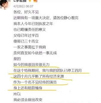 在之前李宏毅发的微博中,他自己承认了如今面对的尴尬情况,他已经到了要扛起家庭责任的时候,可是事业一事无成,自己的工作团队四个月没有开工,也没有收入,而自己更是赔款缠身,因为这些问题,李宏毅开始想赚快钱了,之前还在好好地当演员,现在则开始直播带货了。