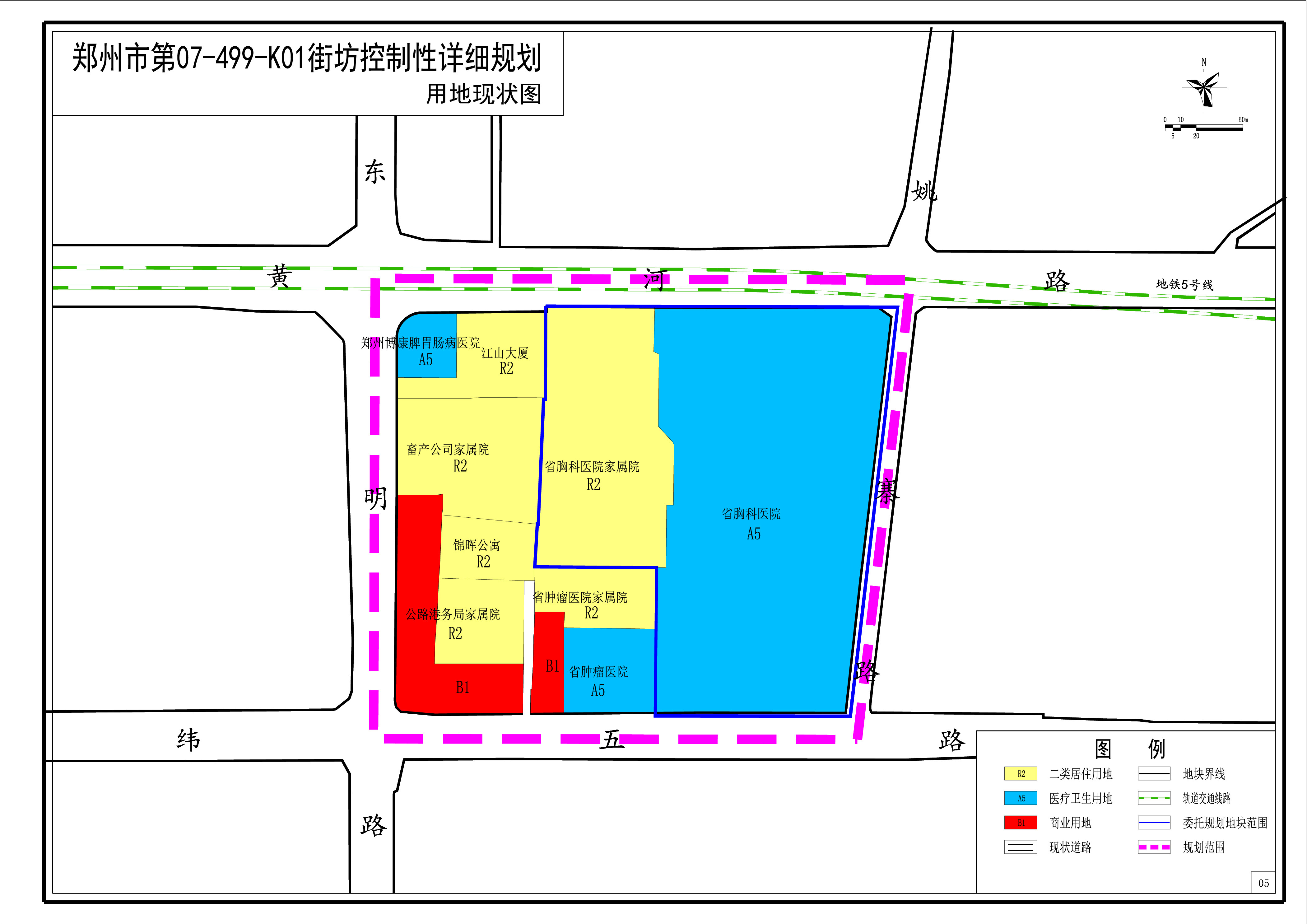 从用地现状图来看,目前规划地块范围内主要是省胸科医院及省肿瘤医院、郑州博康脾胃肠病医院在内的医疗卫生用地,商业用地及二类居住用地,包括江山大厦、锦晖公寓等。