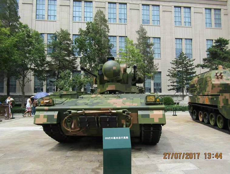 09式双管35毫米自行高炮重30吨、长6.7米、宽3.2米、成员3人、最大射速单管每分钟550发、有效射程4千米。不过这款自行高炮携带的雷达的探测范围约为20千米,而且装有红外/光电瞄准系统,因此具备全天候作战能力。09式双管35毫米自行高炮目前已取代95式双管25毫米自行高炮,与红旗-7B、红旗-17近程防空导弹共同组成了一张中国要地或野战近程防空的大网。