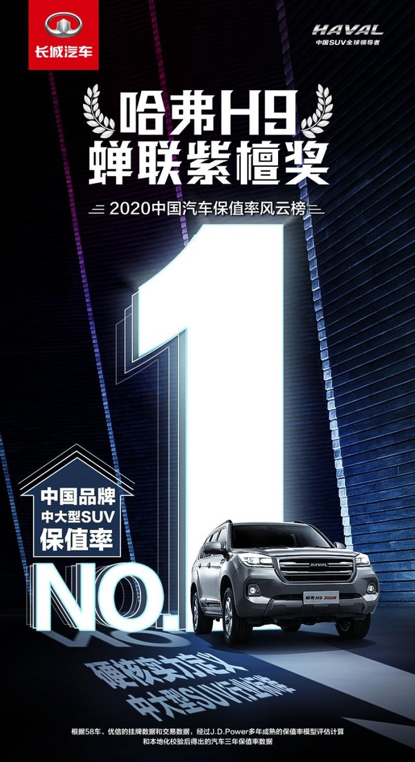 强悍的产品实力不仅仅赢得市场的信赖,更使其成功突破中国汽车品牌保值率的天花板,去年年末,在由58同城·58汽车主办、J.D. Power协办的2020中国汽车风行汇年度盛典上,哈弗H9蝉联紫檀奖,成为中国品牌中大型SUV保值率NO.1,成为名副其实的硬派越野标杆。
