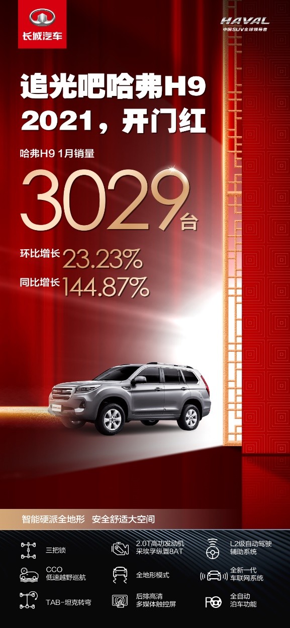 2020年哈弗H9给硬派越野市场注入一剂猛药,全年22035台的销量,让汽车市场看到了中国硬派越野旗舰的豪横实力。2021年,哈弗H9将市场再一次展现了强大的市场统治力,2021年1月,哈弗H9销量达3029台,同比增长144.87%,环比增长23.23%。也许也许月销3000在大众眼里并不是那么亮眼,可在强敌环伺的硬派越野市场取得这 样的成绩,足以说明哈弗H9在硬派越野市场,早已站稳脚跟。