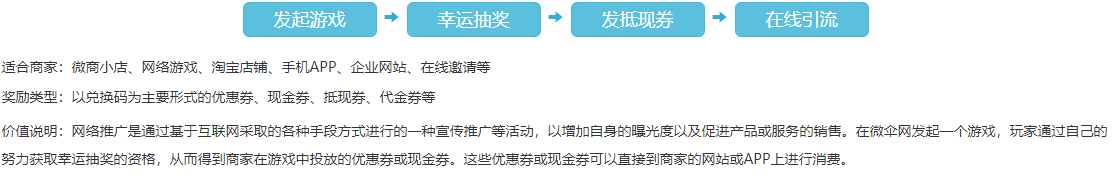 在微伞网发起一个游戏,玩家通过自己的努力获取幸运抽奖的资格,从而得到商家在游戏中投放的优惠券或现金券。这些优惠券或现金券可以直接到商家的网站或APP上进行消费。