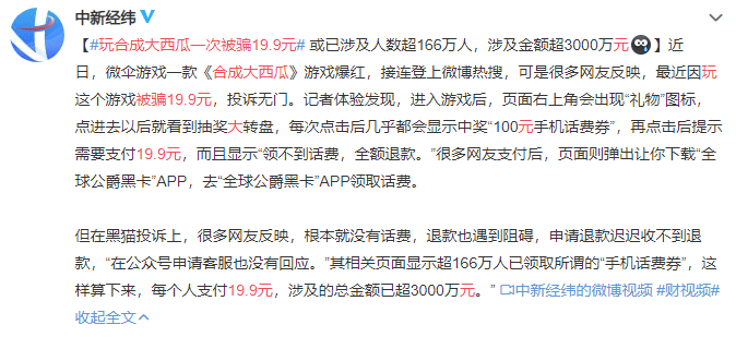 有很多网友反映,自己玩合成大西瓜被骗19.9元,不仅投诉没用,钱也退不出来。