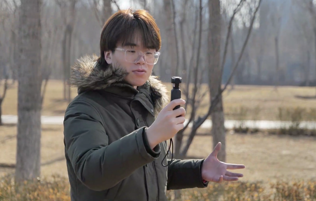比如在室外, DJI Pocket 2 就是最小的录制设备,给别人或者自己的压力都非常小,而且因为它可以跟着人脸,所以可以不怎么管脸是否在镜头里面,只关注于自己的表达就行。在室内拍摄的话,对好人脸,放在一个稍微高一点的地方就可以录制了。