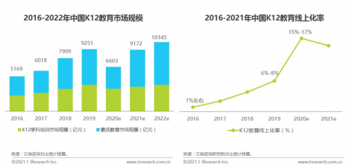 近日,艾瑞咨询发布《2020中国在线教育行业研究报告》显示,2020年在线教育行业市场规模同比增长35.5%至2573亿元,整体线上化率23-25%。其中,K12学科培训赛道在线化进程加快是在线教育市场快速增长的最主要贡献因素之一。