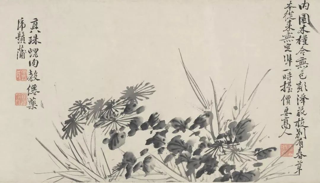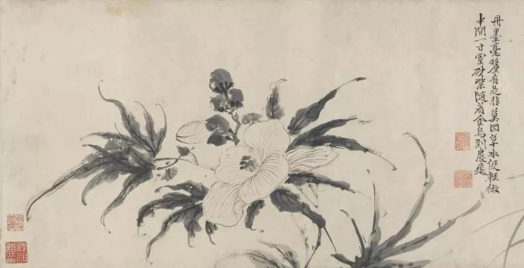 《墨花钓艇图》与《墨花十二种图》两卷还具有一个明显的共同之处,即在画面形式上表现出“间画间题”的特点。不唯如此,在上海博物馆所藏两件《花卉图》、天津博物馆所藏《花卉图》、无锡博物院所藏《四季花卉图》等代表作品中,陈道复均采用了一花一题的画面形式,其草书诗题与四时花卉搭配组合在一起,给人以浑然天成之感。