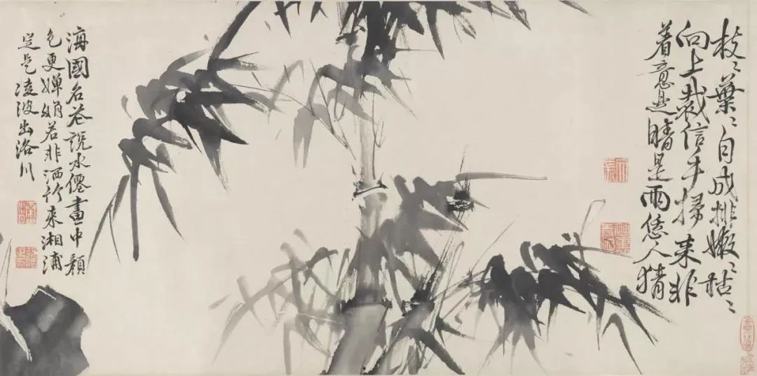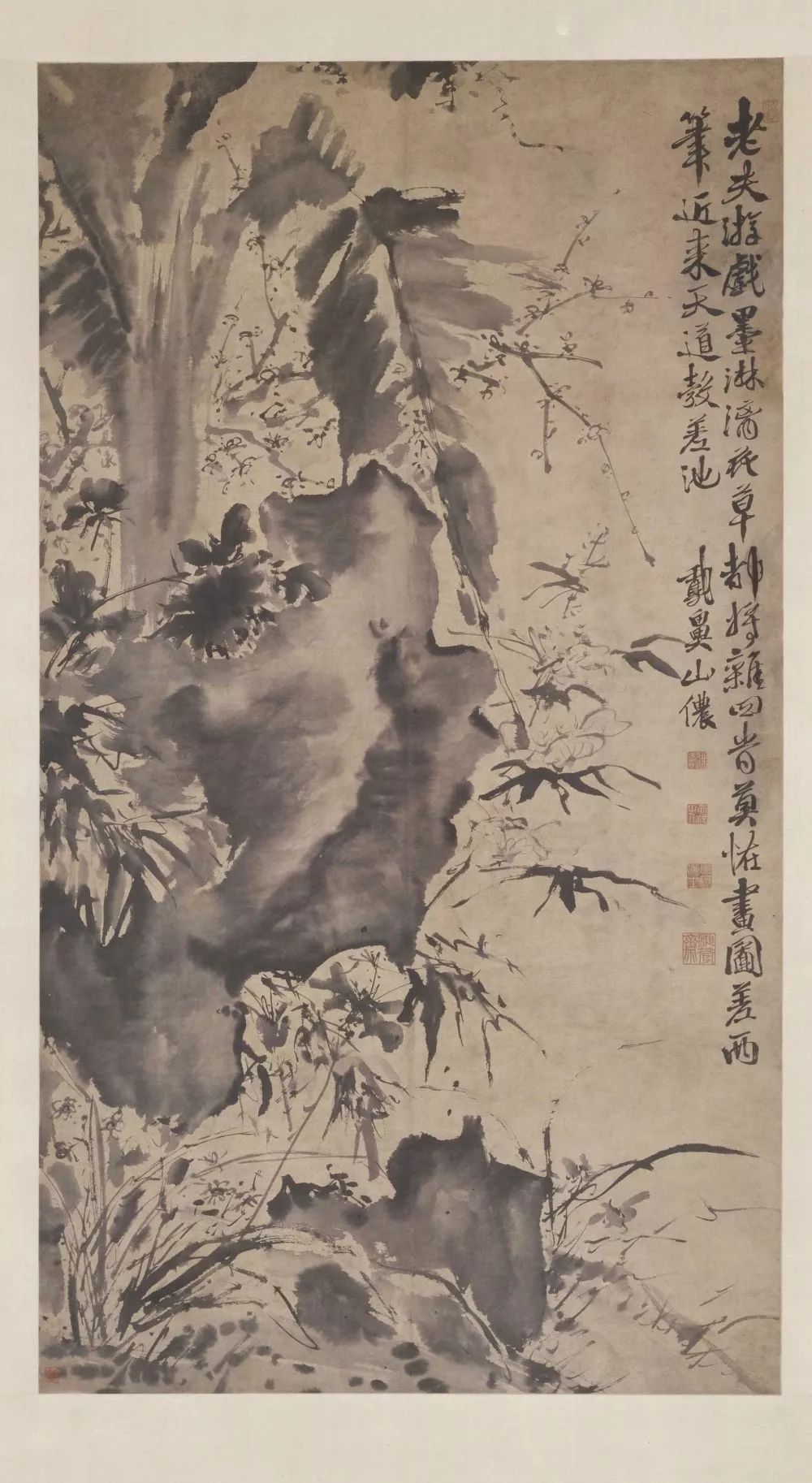他画竹、牡丹实在画人,实在抒发心中块垒。有题墨牡丹云:“牡丹为富贵花,主光彩夺目,故昔人多以钩染烘托见长,今以泼墨为之,虽有生意,终不是此花真面目,盖余本窭人,生与梅竹宜,至荣华富丽风,若马牛宜弗相似也。”可见,他的泼墨牡丹不光是形式风格上的一种创造,而是有着深刻的思想意义的艺术创新。