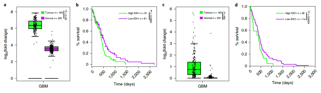 根据WHO对GBM的最新分型标准,GBM分为IDH野生型、IDH突变型和NOS型,其中90%以上GBM IDH突变为IDH1型突变。IDH1和IDO1是两种典型的与免疫抑制相关的生物标志物,通过深入的生物信息学分析和数据挖掘,研究者发现两者mRNA在GBM患者肿瘤组织中均呈现高表达,而且两者均表现出与患者生存期负相关性。通过GBM患者临床样本分析,研究者进一步确证了肿瘤组织IDH1和IDO1的表达水平明显高于癌旁正常脑组织。