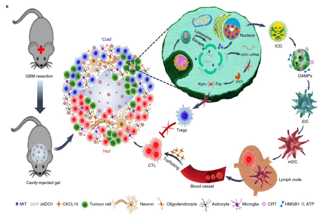 本研究中作者通过对肿瘤相关小胶质细胞/巨噬细胞仿生构建了具有肿瘤归巢作用的纳米免疫调节剂用于追踪定位脑肿瘤微小迁移灶并触发肿瘤细胞免疫原性死亡,产生肿瘤相关抗原,增加T淋巴细胞的激活;利用水凝胶贮库对趋化因子CXCL10的缓释作用,实现了活化T细胞向中枢神经系统的募集;最后,通过沉默IDO1调控肿瘤细胞氨基酸代谢克服Tregs相关的免疫抑制,进一步放大了该肿瘤杀伤的免疫反应。