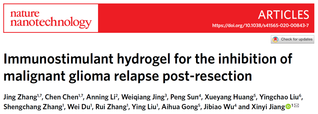 2021年2月1日,山东大学药学院姜新义教授团队在 Nature 子刊 Nature Nanotechnology 杂志发表了题为:Immunostimulant hydrogel for the inhibition of malignant glioma relapse post-resection 的研究论文。